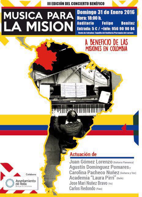 El próximo domingo 31 de enero, nuestro consiliario Carlos vuelve a organizar el Concierto «Música para la misión» a beneficio de las misiones en Colombia. Será a las 18.00h en el Auditorio Felipe Benítez. La entrada cuesta 5€ y puede comprarse tanto en las taquillas del Auditorio como en la Parroquia Ntra. Sra. del Carmen.
