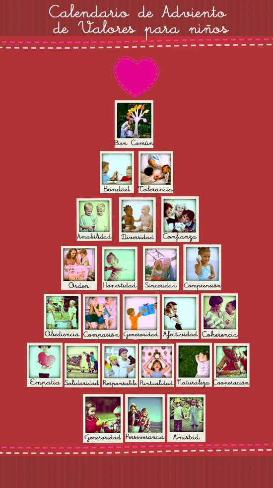 ¿Os animáis a participar en nuestra dinámica de Adviento en familia? Os presentamos este Árbol de Navidad con distintos valores. Durante estas semanas, nos pararemos a reflexionar en ellos y veremos qué errores cometemos. Tras esto, podemos ponernos pequeños objetivos para mejorar. Por ejemplo, con respecto al valor de la afectividad, podemos proponernos «le daré un beso de buenos días y de buenas noches a toda mi familia».