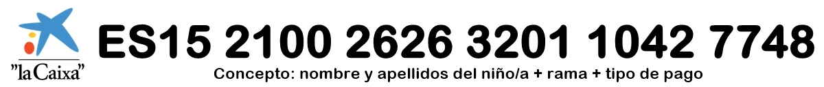 Estamos recibiendo algunos pagos a través del banco en el que no aparecen indicados en el concepto el nombre del niño/a, su rama ni si se trata de la cuota trimestral o la acampada. Os recordamos que hay que indicarlo para que los Tesoreros puedan saber a quién corresponde el pago. Si algún padre o madre ha realizado la transferencia sin poner el concepto o no ha indicado el nombre de su hijo/a, os pedimos que os pongáis en contacto con Cecilia (whatsapp: 619680024) para saberlo.