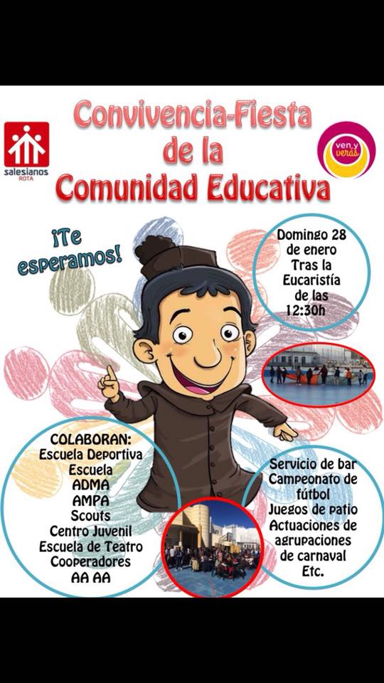 Este domingo día 28 de enero será la Convivencia-Fiesta de la Comunidad Educativa que arrancará con una eucaristía y continuará con juegos, animaciones, deportes y una barra de bar con precios populares. Nos veremos todo el Grupo a las 12.00h en el Colegio con uniforme y pañoleta y después podremos quedarnos a comer y pasar la tarde con juegos que organizaremos los responsables.