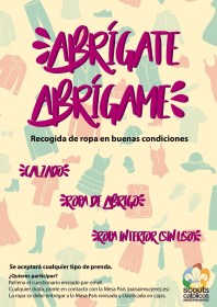 Desde la Mesa País de Delegación nos proponen el Proyecto «Abrígate, abrígame», que consiste en la recolección de ropa en buenas condiciones para repartir entre distintas asociaciones que lo necesitan. Principalmente, necesitamos calzado, ropa de abrigo y ropa interior que esté sin usar, pero servirá cualquier tipo de ropa. Si tienes algo en casa que ya no necesitas puedes traerlo mañana sábado día 9 de marzo a las 16.00h al comienzo de la reunión.