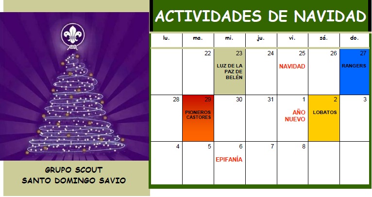 Este año no podremos realizar nuestro Campamento de Navidad durante el período de vacaciones. Vamos a sustituir el Campamento por una actividad cada rama, que seguirá la misma dinámica y protocolos que hemos tenido hasta ahora, pero que será un poco más larga de duración en el día. Os informaremos de cada una de forma más específica. Por ahora, os dejamos las fechas para que los niños/as y las familias podáis organizaros.