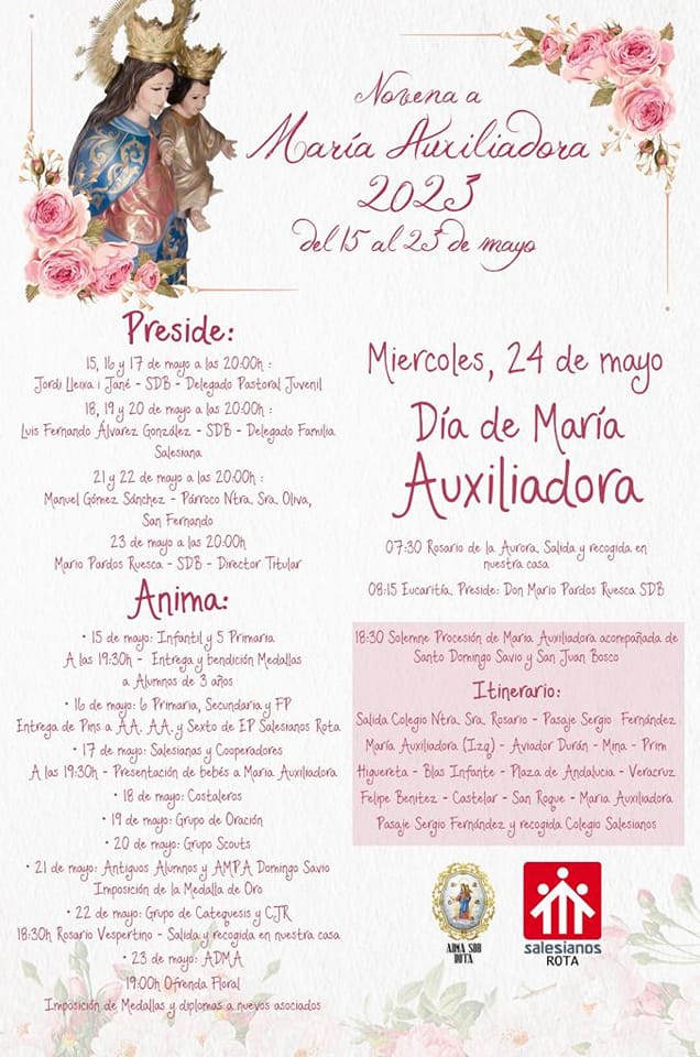 En este mes de mayo nuestra Casa Salesiana se encuentra inmersa en las celebraciones dedicadas a María Auxiliadora. Durante estos días se desarrolla la Novena, en la que nosotros participaremos el próximo sábado 20 de mayo. Por ello, ese día, adaptaremos el horario de las reuniones para quedarnos al finalizar directamente en la eucaristía, a la que también estáis invitados todas las familias que queráis participar.