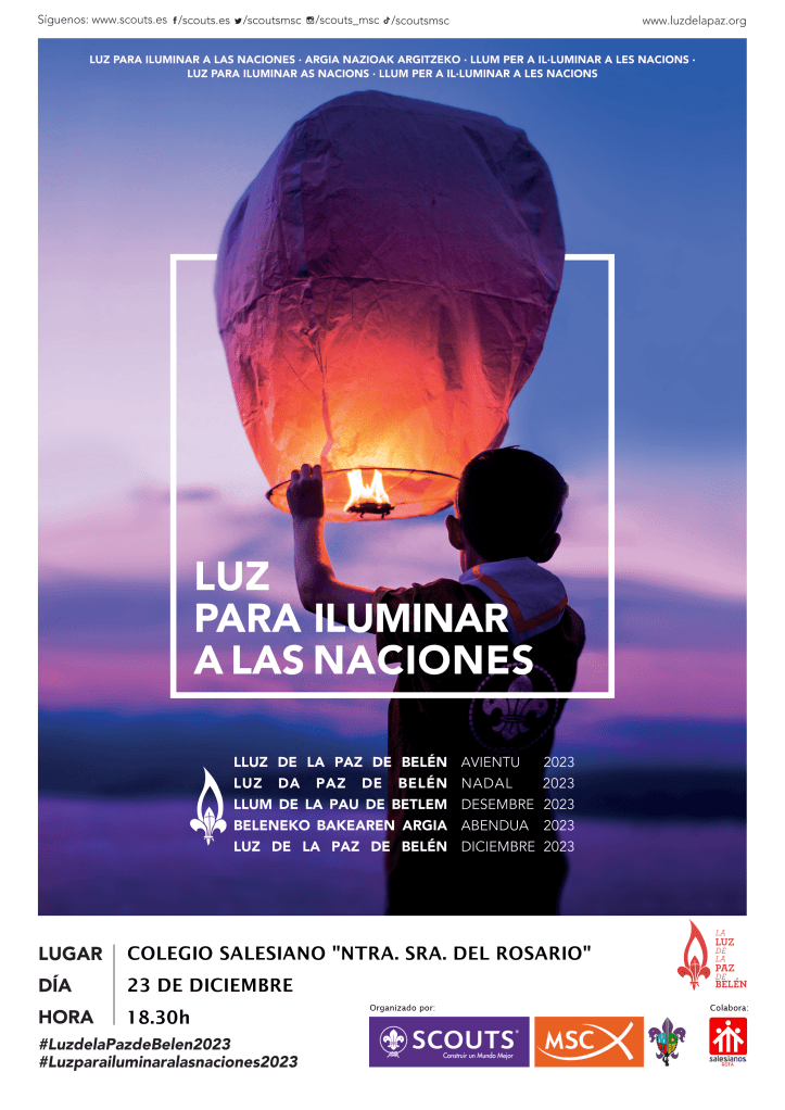 Este sábado 23 de diciembre tendrá lugar el Acto de Entrega y Reparto de la Luz de la Paz de Belén en la capilla del Colegio Salesianos a las 18.30h. Para ello nos veremos todas las ramas a las 18.00h para prepararlo. La actividad finalizará a las 19.30h aproximadamente. Los niños/as deberán traer uniforme y pañoleta.