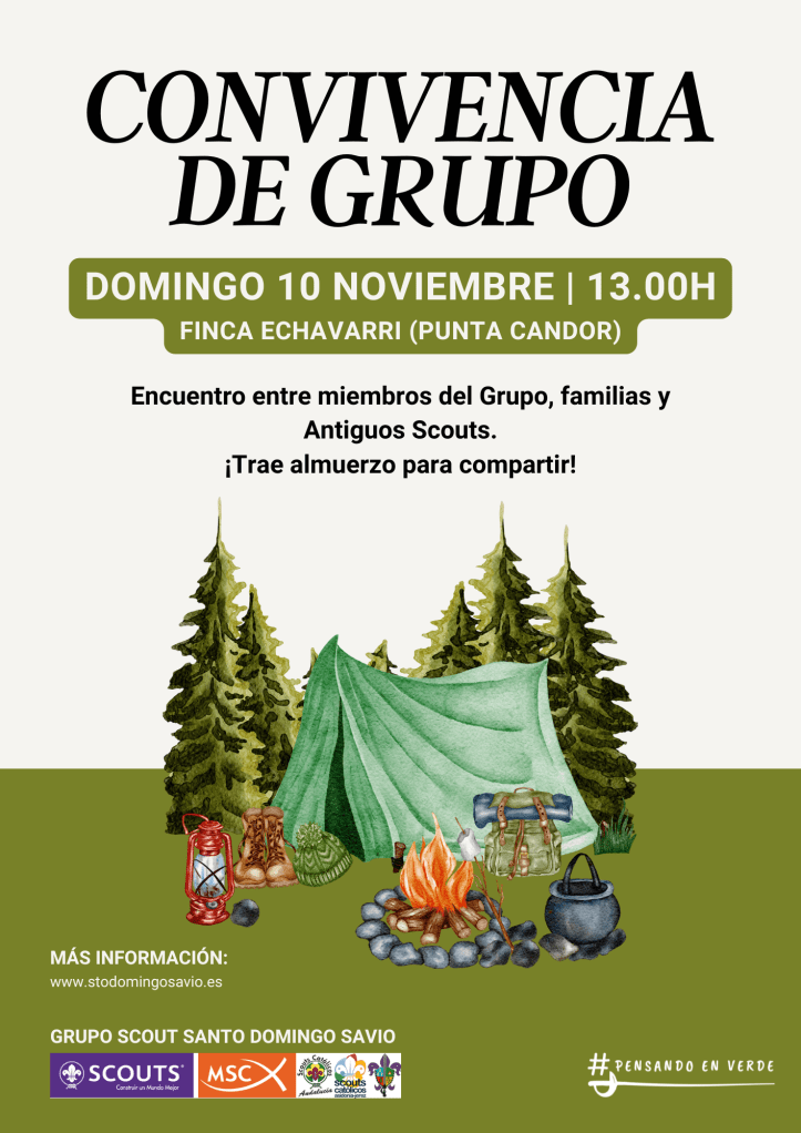 Como cada año, al finalizar la Acampada de Inauguración, vamos a realizar una Convivencia de Grupo que sirve como acercamiento entre las familias, los niños/as y los responsables, y como punto de encuentro para los antiguos scouts. Tendrá lugar el próximo domingo 10 de noviembre en la Finca Echavarri a partir de las 13.00h.