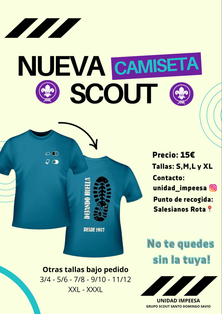 Como sabéis de los últimos días, la Unidad Pioneros estamos vendiendo unas camisetas scout exclusivas para conseguir fondos para nuestra Empresa. Tenemos varias tallas ya disponibles (S-M-L-XL), pero también tenemos otras tallas disponibles bajo encargo (3/4 – 5/6 – 7/8 – 9/10 – 11/12 y XXL – XXXL).