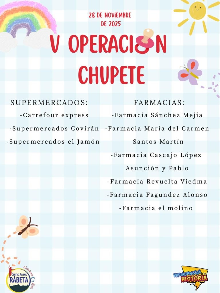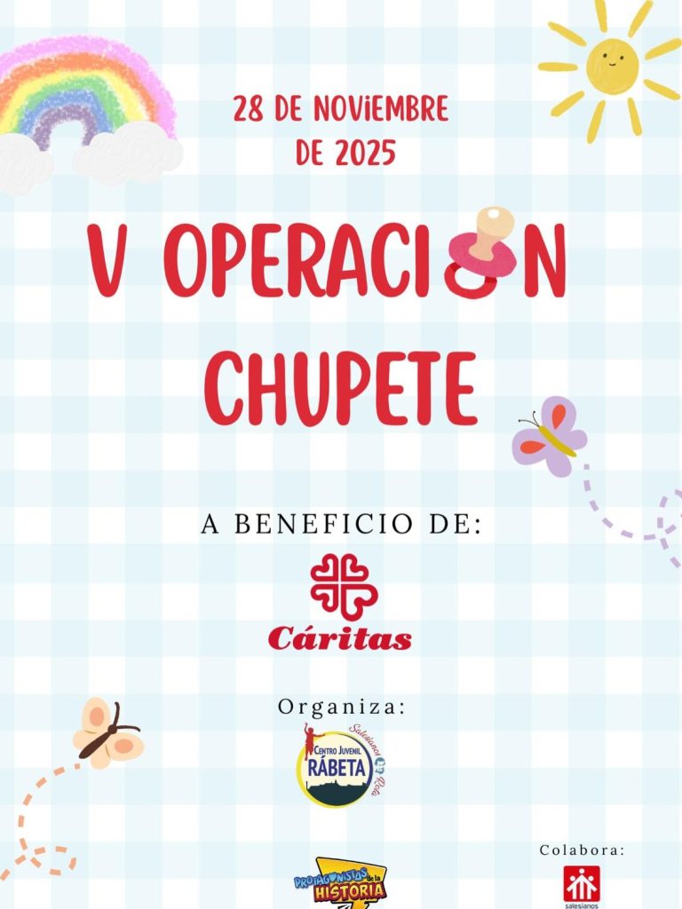 El Centro Juvenil «Rábeta», del Colegio Salesianos, organiza mañana viernes 28 de noviembre durante la tarde la V Operación Chupete, una campaña en la que salen con sus niños/as a distintos supermercados y farmacias del centro a recoger productos infantiles (pañales, potitos, leche, etc.) a beneficio de Cáritas.