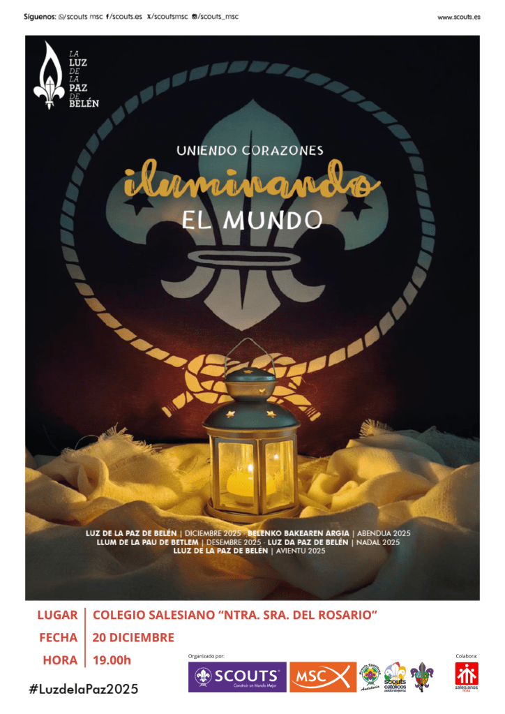 Este sábado 20 de diciembre tendrá lugar el Acto de Entrega y Reparto de la Luz de la Paz de Belén en la capilla del Colegio Salesianos a las 19.00h. Para ello nos veremos todas las ramas a las 18.30h para prepararlo. La actividad finalizará a las 20.00h aproximadamente. Los niños/as deberán traer uniforme y pañoleta.